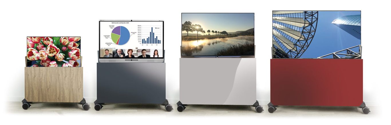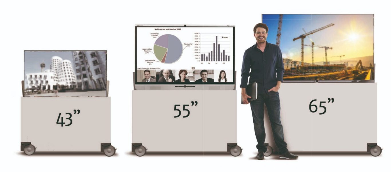 Sie können wählen zwischen vier Größen für 43", 55", 65"- und 75"-Bildschirme. Außerdem haben Sie die Wahl zwischen fest stehendem Möbeln oder der mobilen Version (mit Rollen) , mit oder ohne Kabeltrommel, mit Fernbedienung und Soundbar.