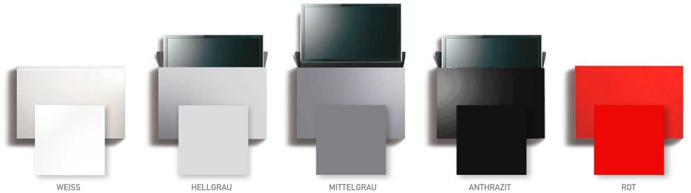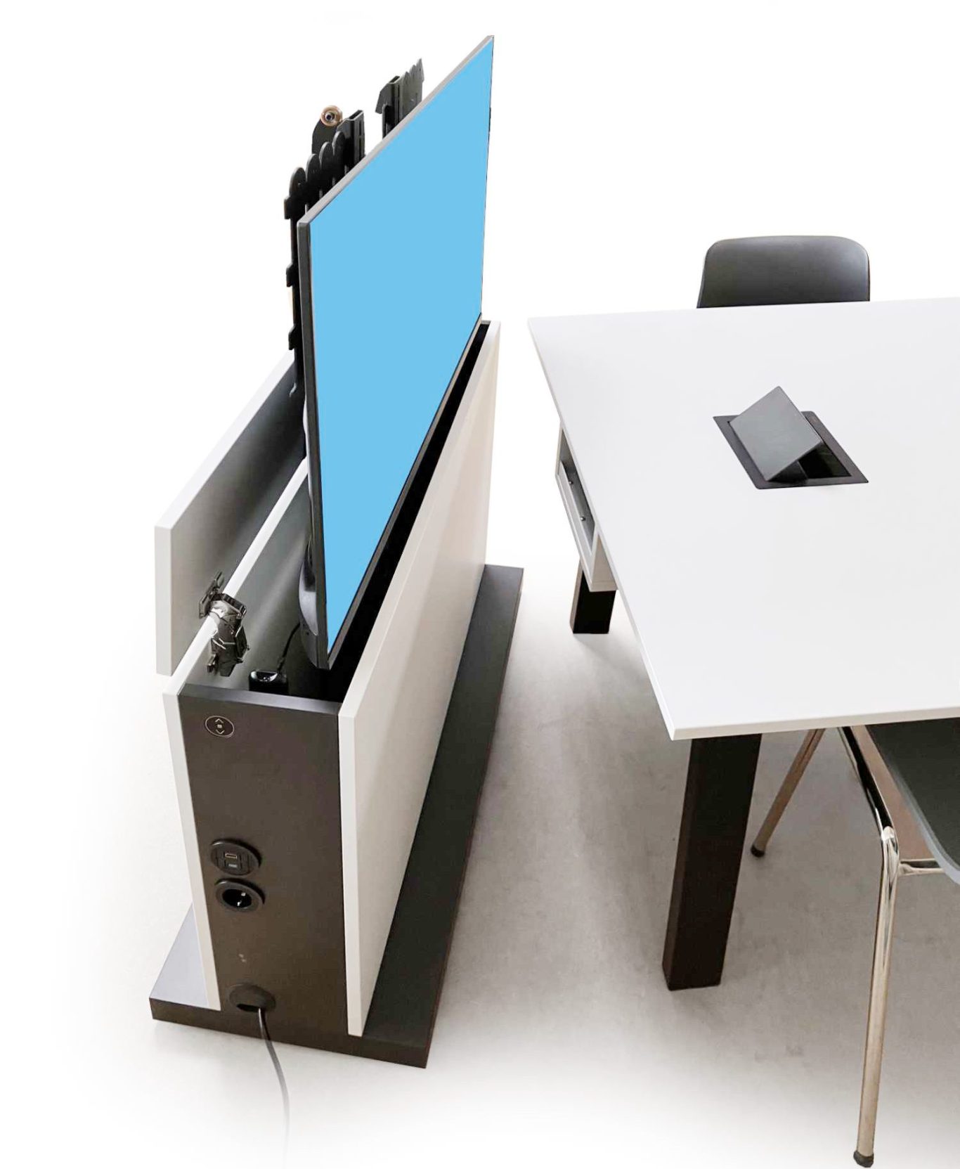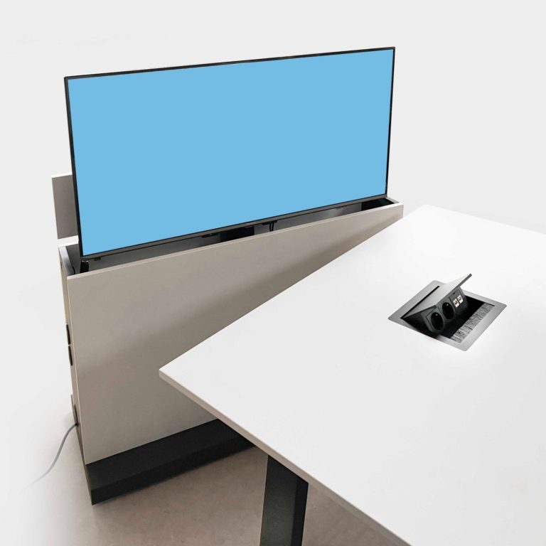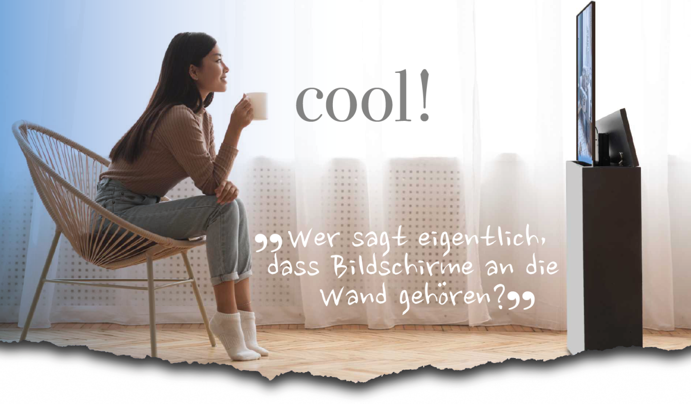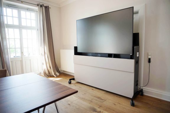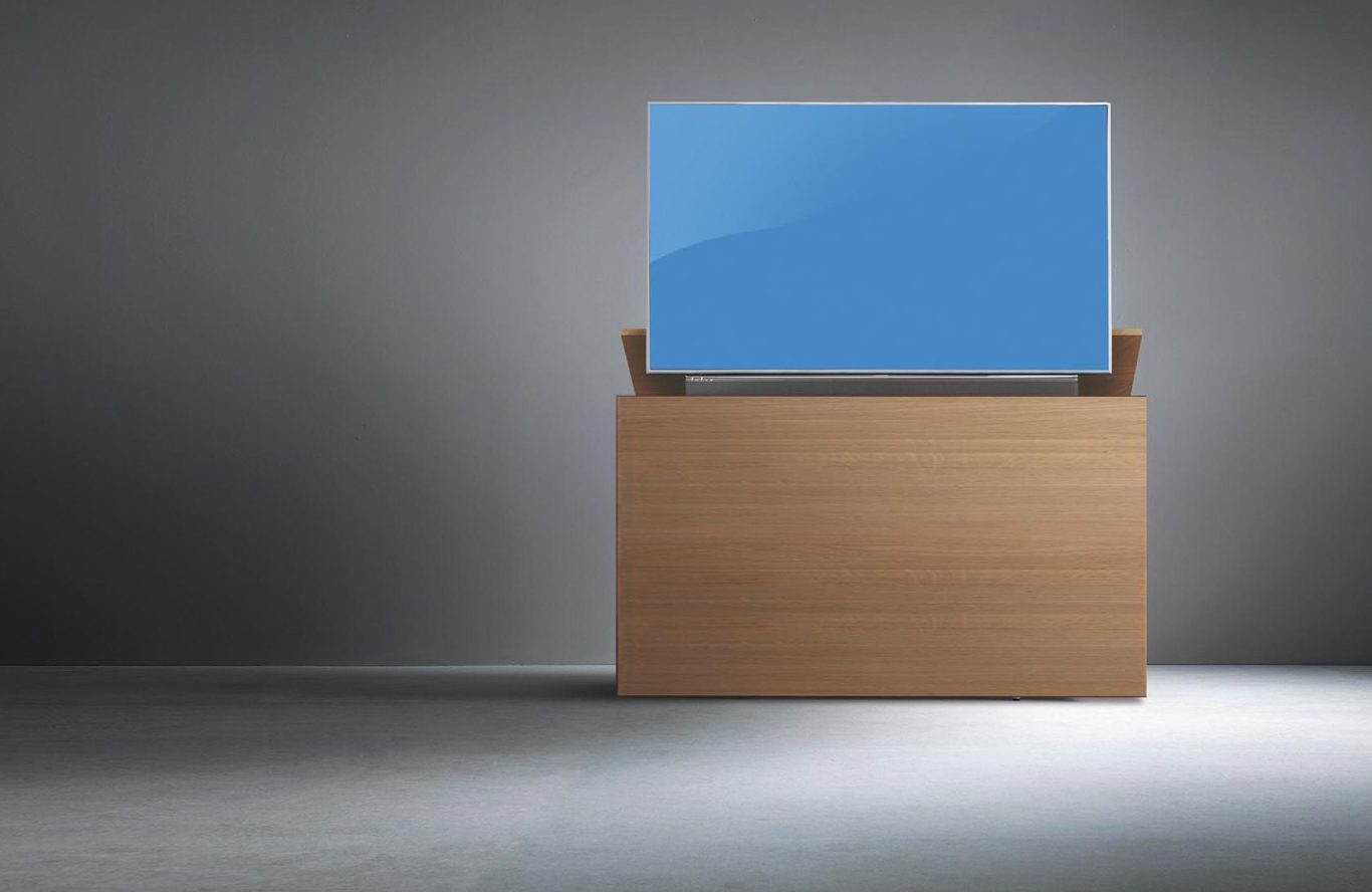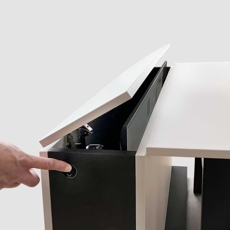 Wir haben die Lösung: Der Bildschirm kommt nur dann zum Vorschein, wenn er gebraucht wird. Aus dem flachen Möbel wird er per Elektro-Hubsystem automatisch herausgefahren. Das geht flüsterleise. Der Bildschirmlift ist mit einem Kollisionssensor ausgestattet, der beim Auftreffen auf ein Hindernis, wie etwa ein offen stehendes Fenster, automatisch stoppt.