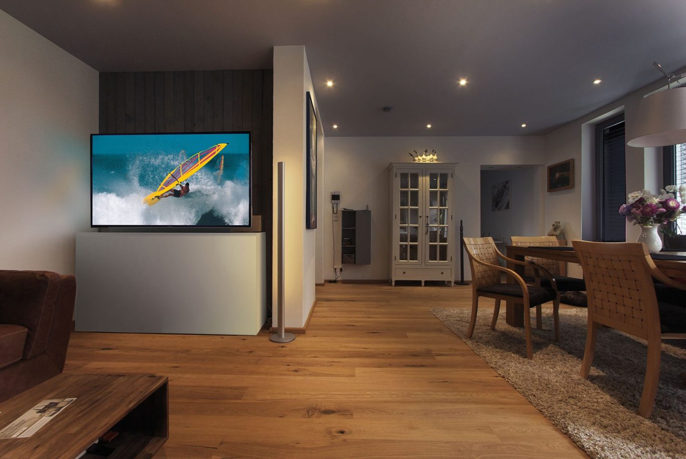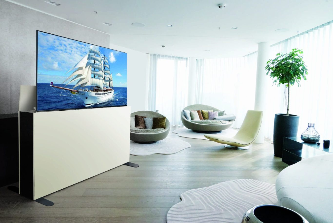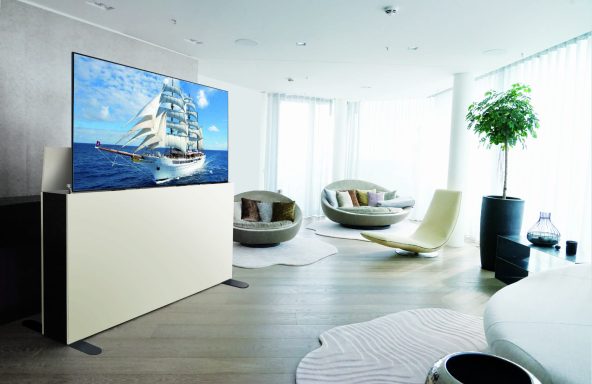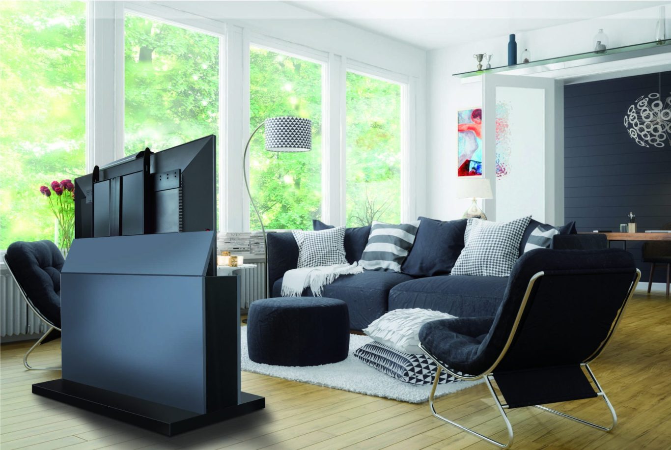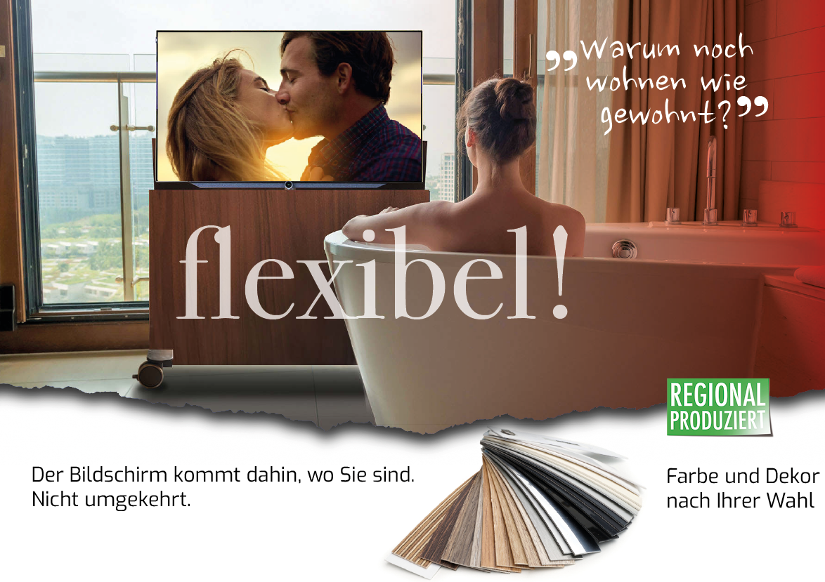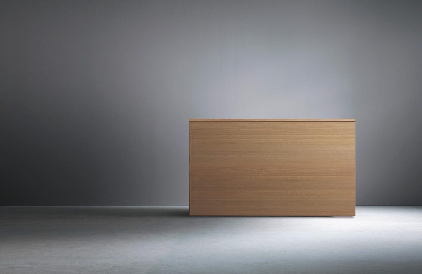 Wir haben die Lösung: Der Bildschirm kommt nur dann zum Vorschein, wenn er gebraucht wird. Aus dem flachen Möbel wird er per Elektro-Hubsystem automatisch herausgefahren. Das geht flüsterleise. Der Bildschirmlift ist mit einem Kollisionssensor ausgestattet, der beim Auftreffen auf ein Hindernis, wie etwa ein offen stehendes Fenster, automatisch stoppt.