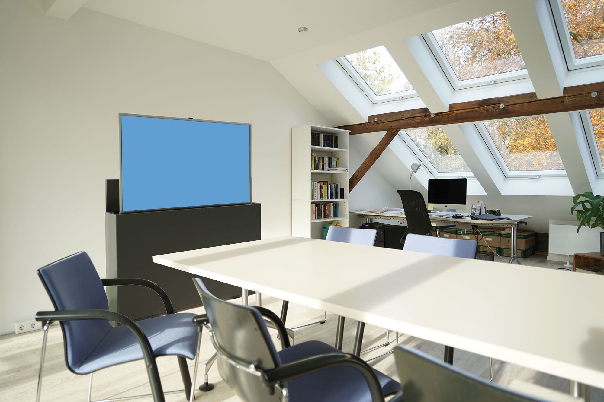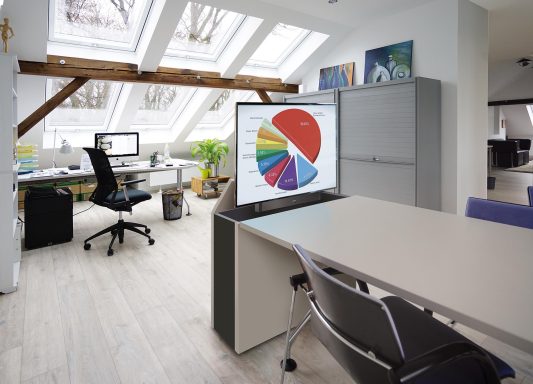 Wenn der Bildschirm eingefahren ist, sieht man nur eine schmale Fuge in der Tischplatte. Durch die Rollen können Sie das Bildschirmboard bei Bedarf auch anderswo nutzen – wo Sie gerade wünschen.