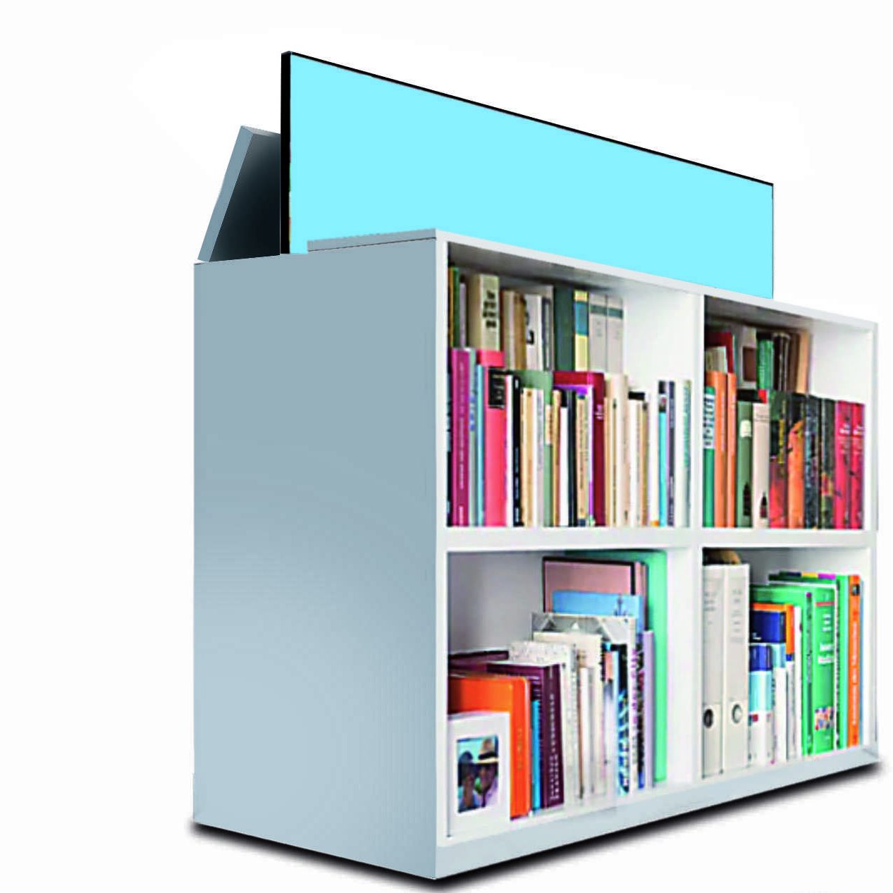 Das ist einzigartig: Vorn ein Sideboard mit einem klassischen Regal. Dahinter, im Korpus versteckt, wartet der Bildschirm auf seinen Einsatz.